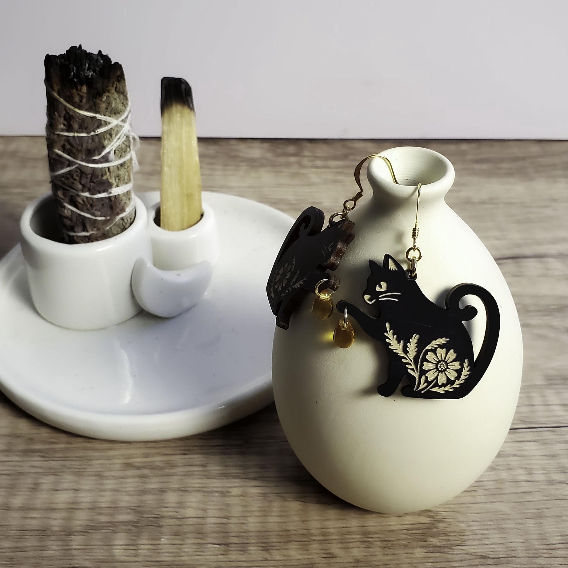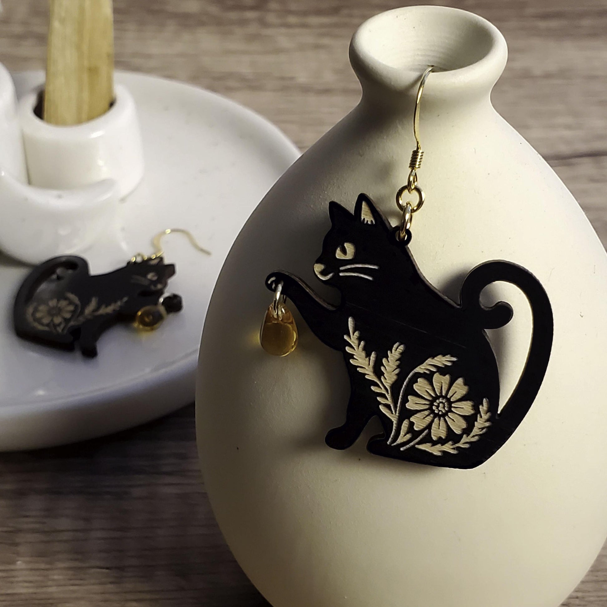 Embrace mystical elegance with these black cat earrings featuring 14K gold ear wires, delicate floral engravings & amber dangles - premium witchy boho jewelry.