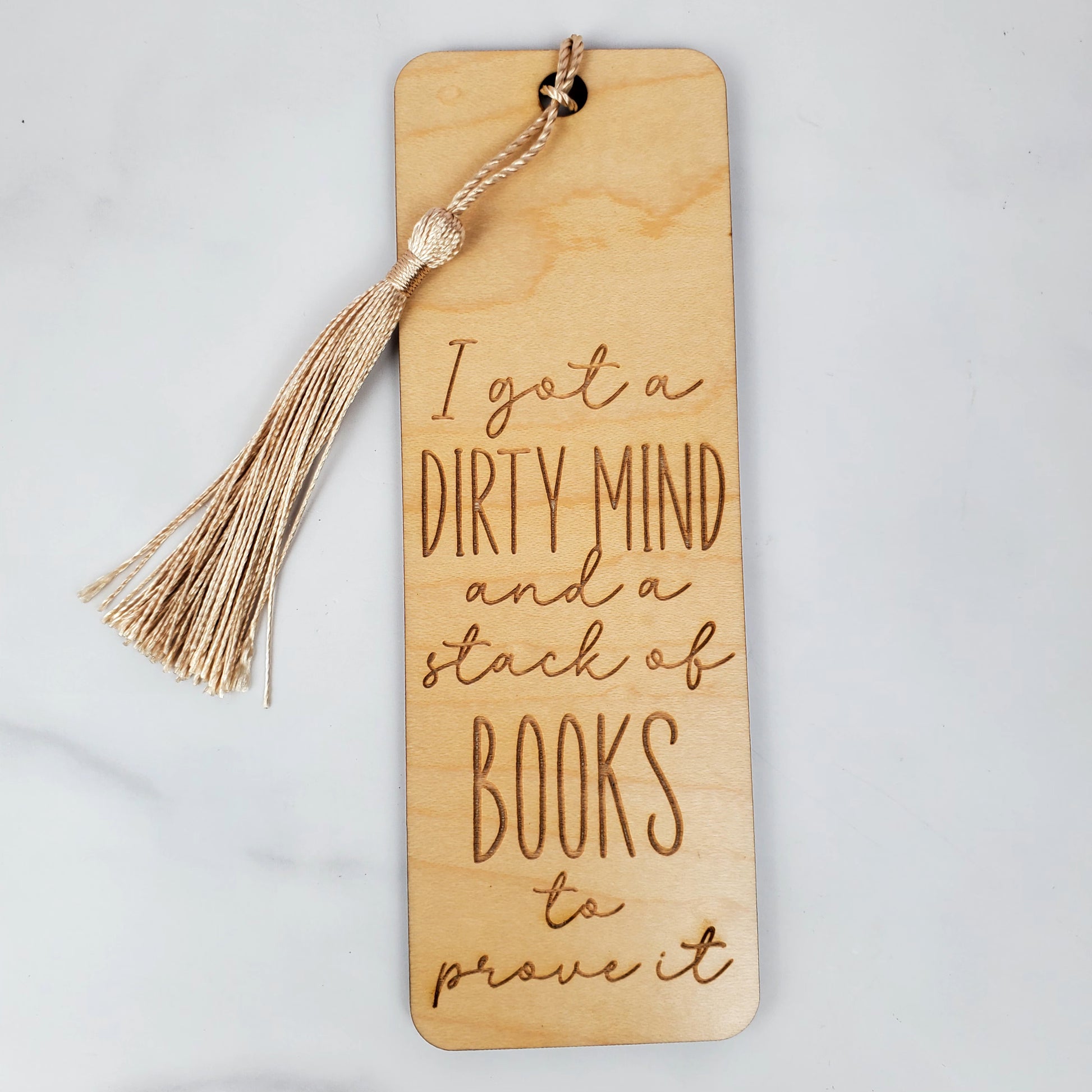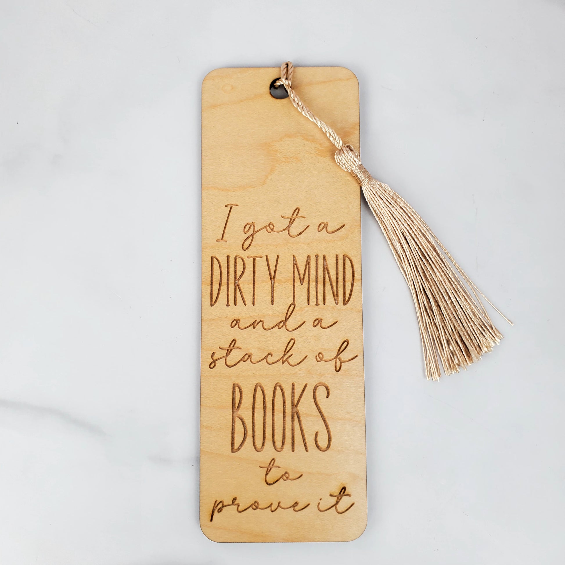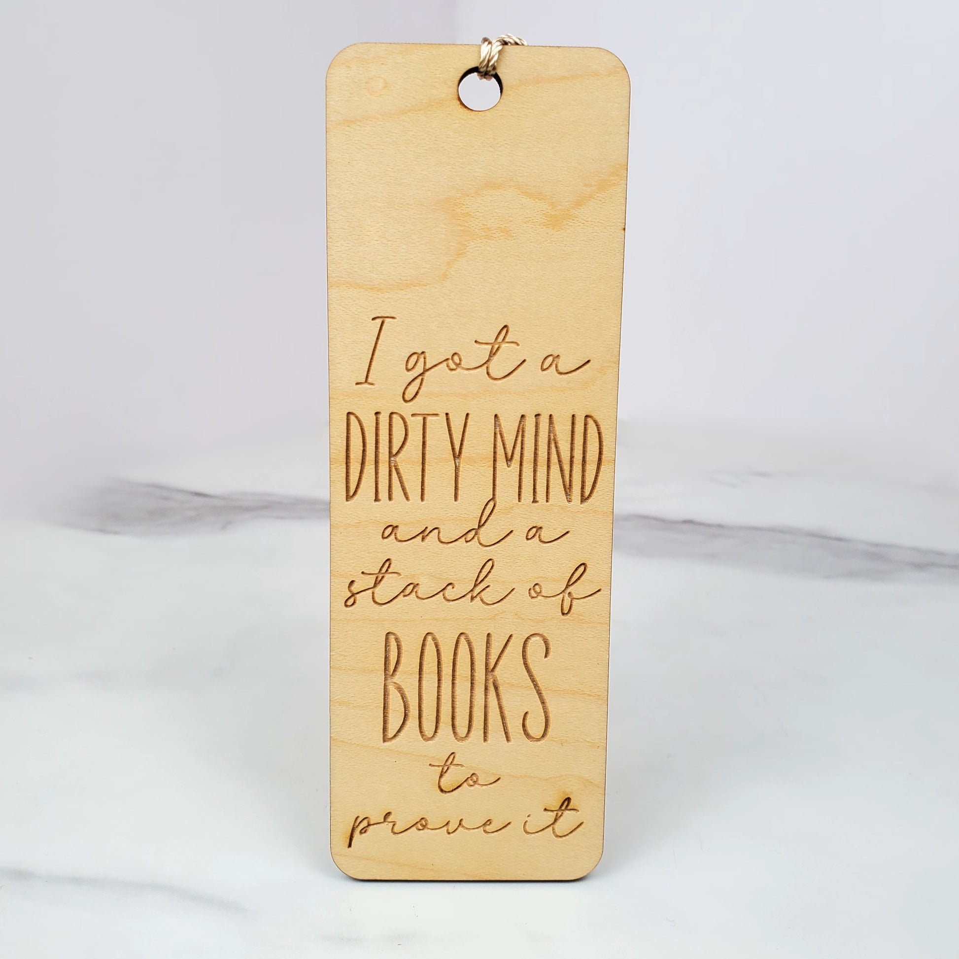Handcrafted wooden bookmark for spicy book lovers. Laser-engraved with "I got a dirty mind and a stack of books to prove it" in playful mixed fonts. Perfect for romance and romantasy readers who like their books with a little heat.