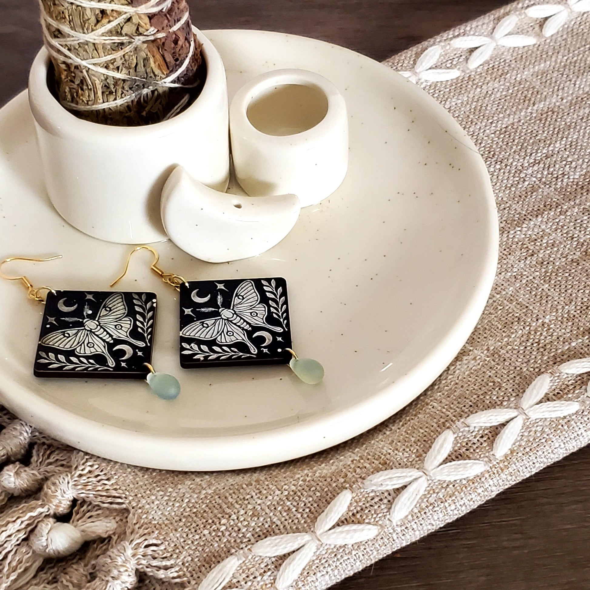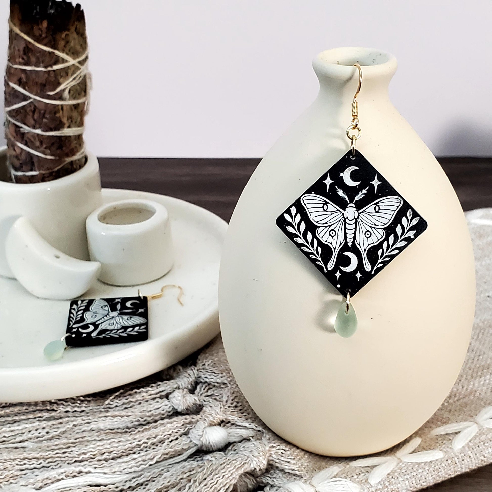 Step into the mystical with these Luna Moth Celestial Earrings, handcrafted from lightweight wood and engraved with moon and star details. These enchanting earrings feature a striking black background with white etching and a soft gemstone-style teardrop charm for extra magic.