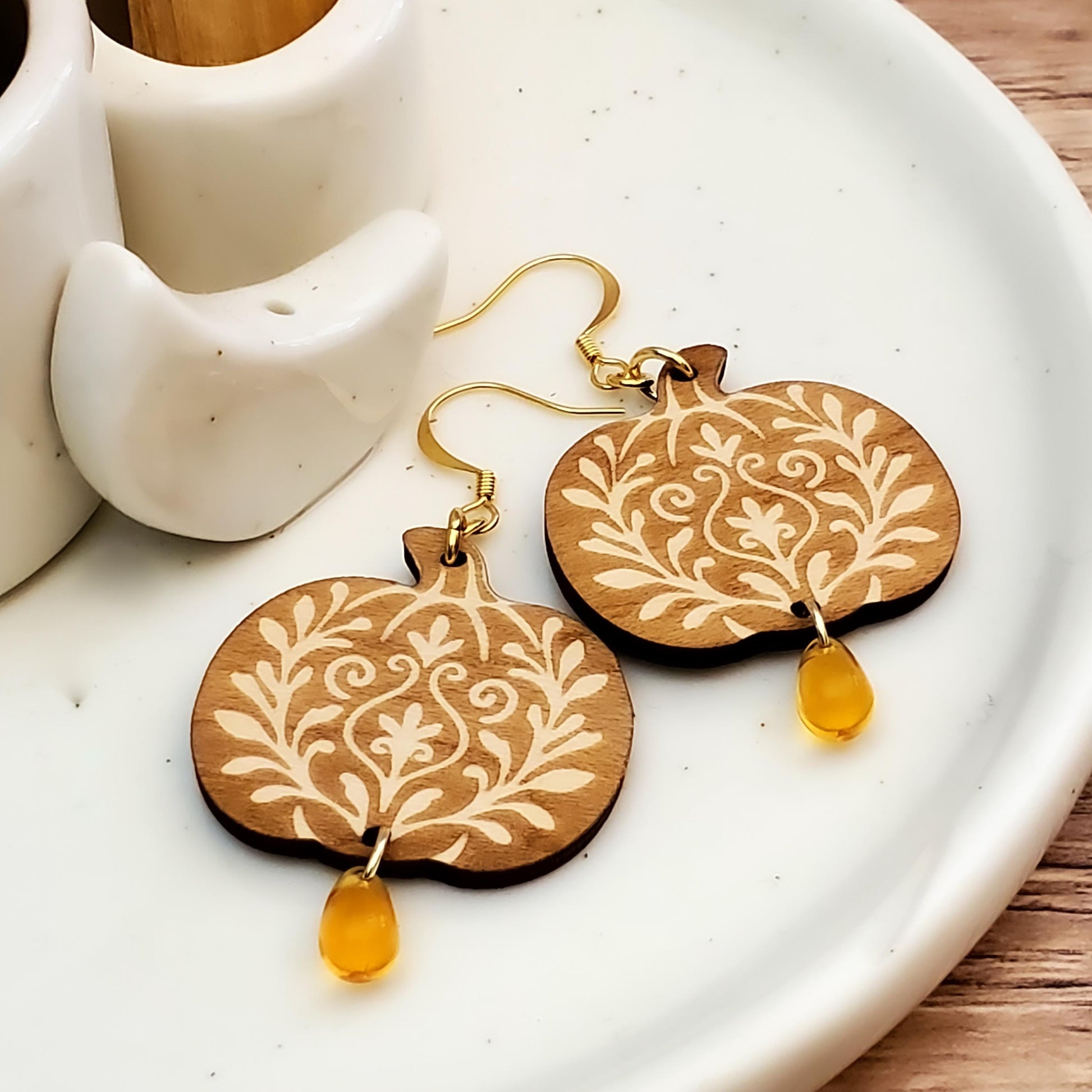 These enchanting wooden pumpkin earrings capture the essence of fall with premium craftsmanship - featuring genuine 14K gold ear wires for sensitive ears and lasting beauty. Each pair showcases intricate laser-engraved damask floral patterns that transform simple pumpkin silhouettes into sophisticated autumn accessories, complete with warm amber-colored glass dangles that mirror the golden hues of harvest season.